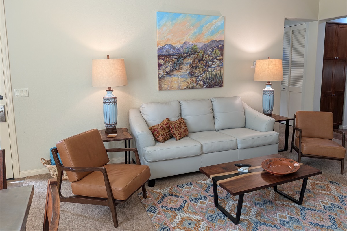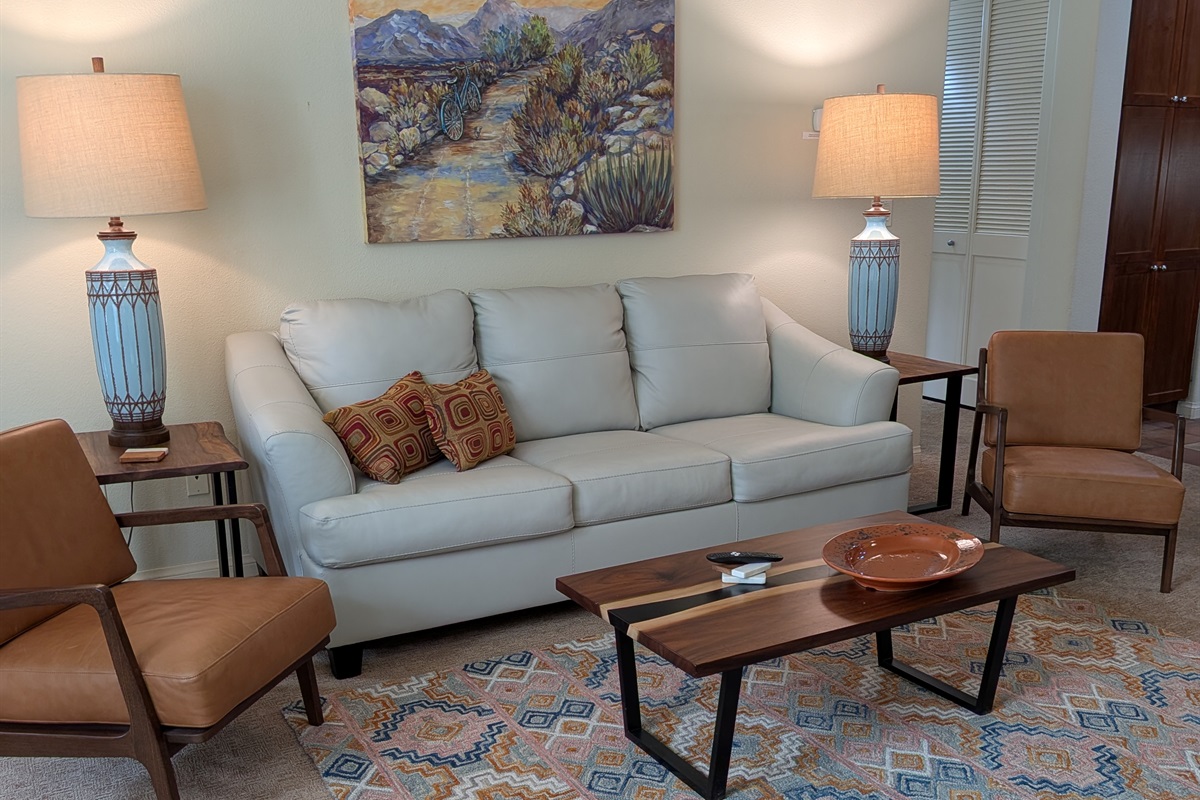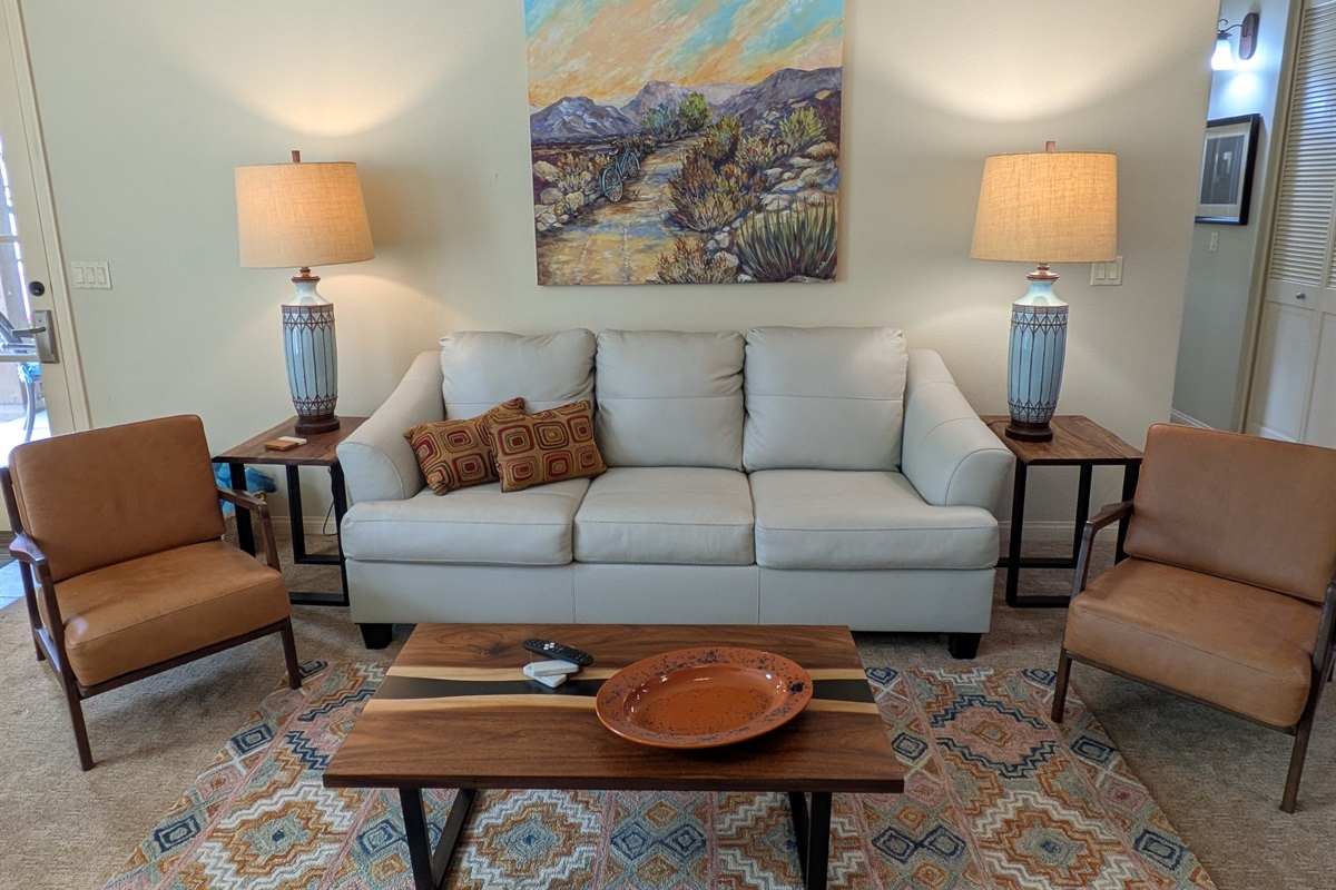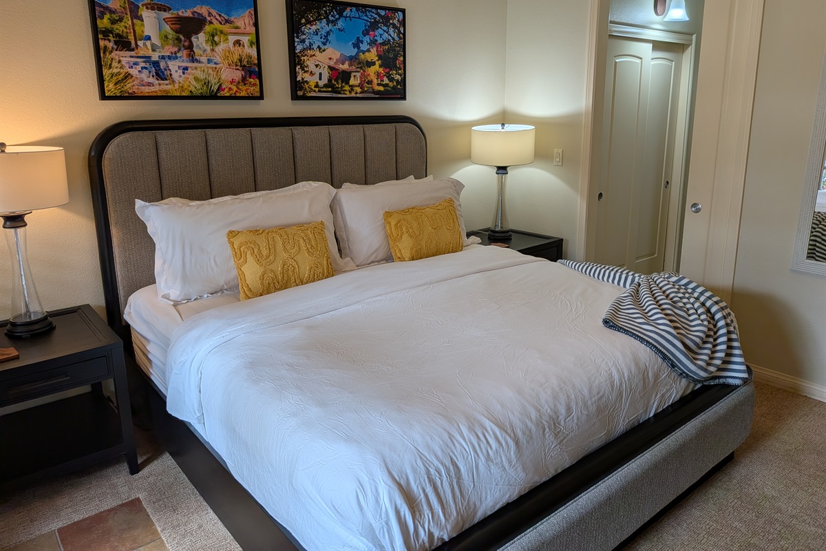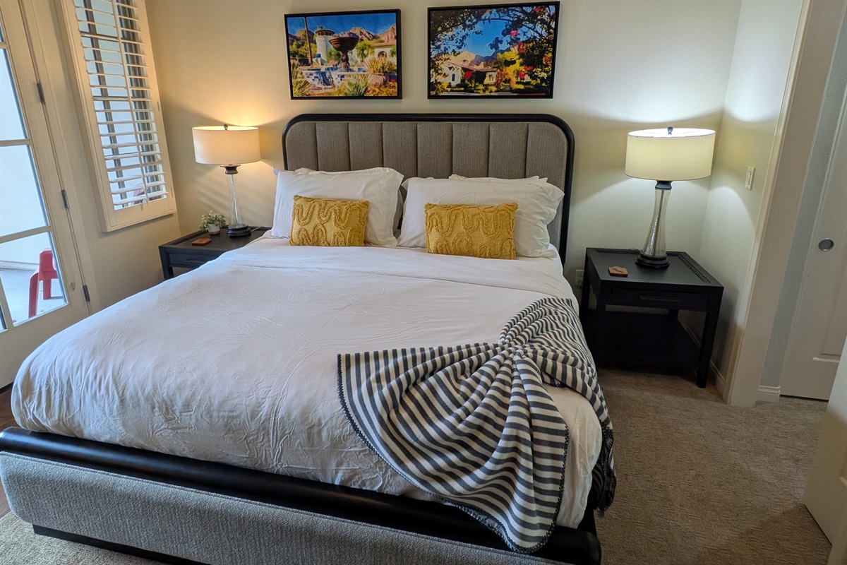 1 Bedroom • 1 Bathroom 1 Bath • Sleeps 2-4This Spanish style beautiful 1 bedroom 1 bath, ground-level single-story condo has all the amenities of a home and more. Guests enjoy a well-stocked full kitchen, large screen TV with movie channels, a gas fireplace, new carpeting, an outdoor grill, and an attached, secure, private garage at no extra charge.